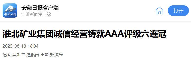 8月12日,安徽淮北矿业集团以优异成绩通过中国煤炭工业协会信用等级现场评价,信用评价级别为AAA。至此,该集团已连续6届获评煤炭行业“AAA级信用企业”。